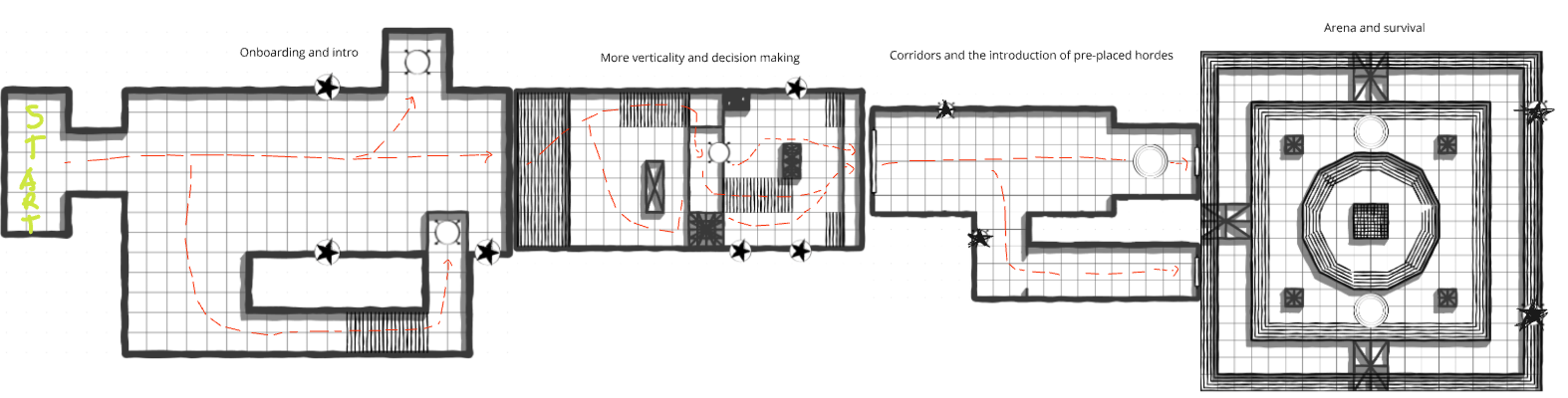 The opening onboarding section (bell pickup) uses scaffolding layouts and enemy spawner systems from my pre-production GYM level. The production team adapted these elements to teach players about horde mechanics, converting testing infrastructure into an effective tutorial experience.